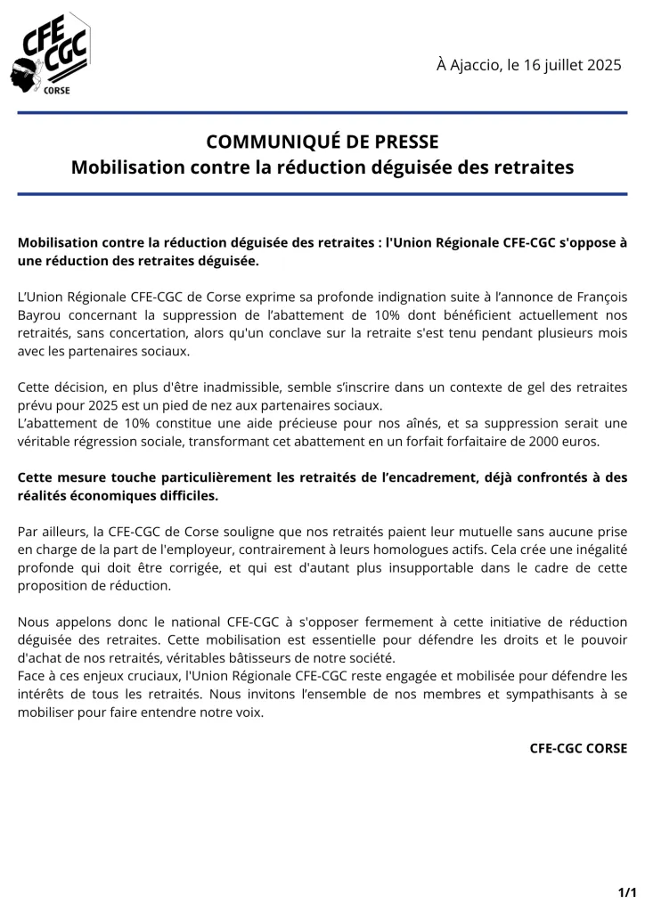Retour aux actualités Date 16.07.2025 COMMUNIQUÉ DE PRESSE – Mobilisation contre la réduction déguisée des retraites Retrouvez le communiqué de presse en format PDF COMMUNIQUE DE PRESSE