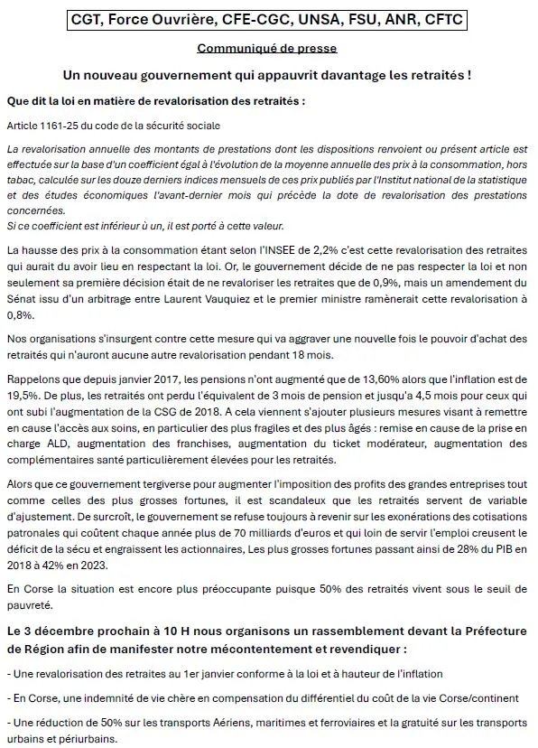 Retour aux actualités Date 27.11.2024 Communiqué de presse – Syndicats retraités de Corse Nous appelons à un rassemblement le 03 décembre 2024 à 10 heures à la Préfecture de Région (Ajaccio). Si vous souhaitez signer la pétition nationale sur les retraites, veuillez trouver, ci-dessous le lien : https://chng.it/6zJ8pdyWPM